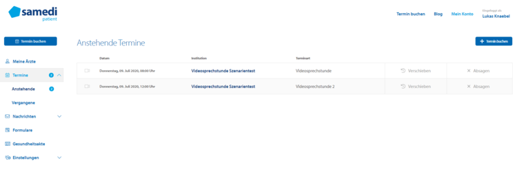 Bietet der Arzt die entsprechende Terminart an, besteht die Möglichkeit als Patient eine Video-Sprechstunde mit dem behandelnden Arzt zu vereinbaren. Die Durchführung der Video-Sprechstunde geschieht ebenso direkt über das samedi Patientenkonto bzw. über einen an den Patient übermittelten Link.