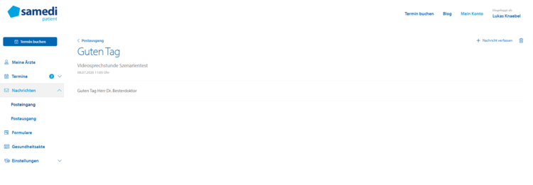 Bietet der Arzt die entsprechende Terminart an, besteht die Möglichkeit als Patient eine Video-Sprechstunde mit dem behandelnden Arzt zu vereinbaren. Die Durchführung der Video-Sprechstunde geschieht ebenso direkt über das samedi Patientenkonto bzw. über einen an den Patient übermittelten Link.